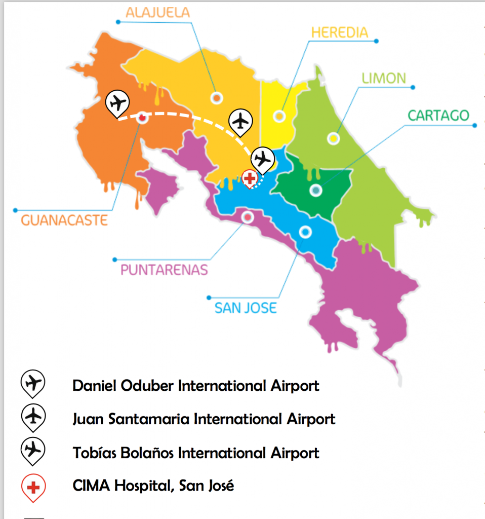 The medical service in Costa Rica will be coordinated by an air service from the Daniel Oduber Airport to the Tobías Bolaños Airport, the distance of the route is 169.2 kilometers with an estimated flight time of 00 hours and 43 minutes; where an ambulance will be transferred to the CIMA Hospital. Soon to enable a landing area. The CIMA Hospital located in Costa Rica, San José, Escazú. In front of the Próspero Fernández Highway, 10 minutes from the Tobías Bolaños Airport and 20 minutes from the Juan Santamaría Airport.